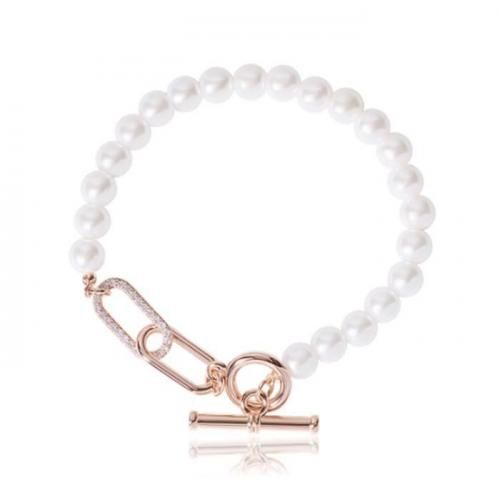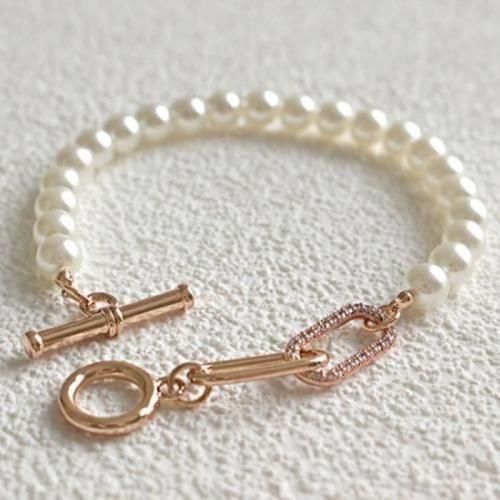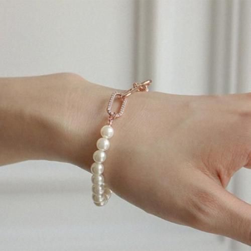 光沢感のあるクリームカラーのパールをベースに、存在感のあるチェーンモチーフを組み合わせたアイリー パールブレスレット。